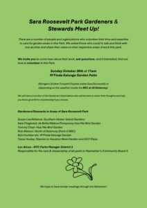 Welcome all to listen in on Gardeners and Stewards of Sara Roosevelt Park discuss where they are working to beautify our Park and how YOU could get involved!!!